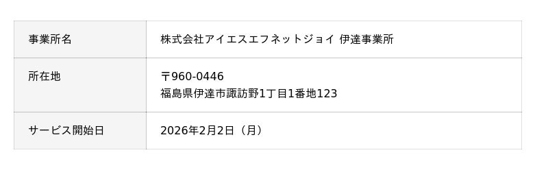 株式会社アイエスエフネットジョイ(本社:東京都新宿区、代表取締役:渡邉幸義、以下、アイエスエフネットジョイ)は、2026年2月1日より福島県伊達市に新たな拠点「伊達事業所(就労継続支援B型事業所)」を開設いたしました。