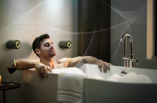 強力なネオジム磁石で底面を金属面に貼り付けられるのもポイント。棚がなくておけないような場所でも耳の高さや視線に合わせて、固定が可能です。例えば半身浴中に、目の前の壁に貼れば、台がないお風呂場でも音楽やラジオを聞くことが可能。映画のセリフもクリアに聞けます。車で移動した先でBGMが欲しいな、なんてときもドアやボディに吸着させて、広がりのある音を楽しめます。