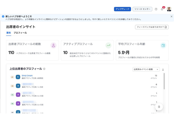 Zoom Webinarsの上位製品である「Zoom Webinars plus」「Zoom Events」は、イベントや参加者に関する詳細なデータ分析機能を搭載しています。Zoom上で開催されたすべてのウェビナーのデータを統合して分析できるので、たとえば「ウェビナー参加回数が多い参加者」や「ライブとアーカイブで繰り返し視聴している参加者」をホットリードとして抽出することができます。また、参加履歴やアンケート回答から参加者個人のインサイトを掘り下げて、どんな興味関心や課題を持っているのかを知ることもできます。