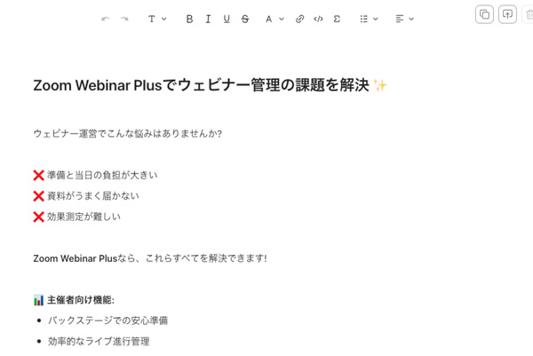 さらに、Zoom Webinars plus/Zoom Eventsでは、生成AIが業務を支援する最新機能も提供されています。たとえばイベントの開催後、イベント内容の要約を自動生成する機能があります。しかも、文章のスタイルや文字量は「ブログ向け」「社内レポート向け」「SNS投稿向け」などと指定することができるので、イベント終了後すぐに目的に応じたサマリー文が出来上がるのです。