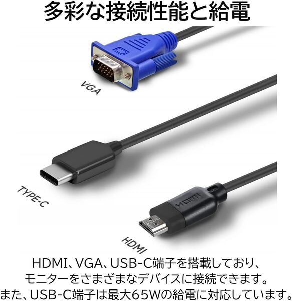 本機最大の特徴は、USB Type-C端子を備えている点です。対応ノートPCであれば、映像出力と給電をケーブル1本でまかなえるため、デスク周りの配線を最小限に抑えられます。
