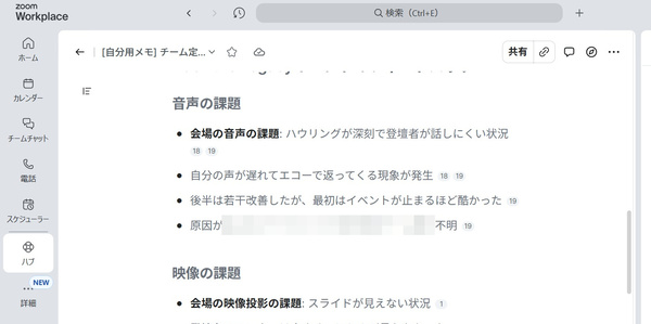 Zoomは現在、AI Companionの技術強化に力を入れており、新機能も次々に発表されています。今年2月の発表では「My Notes」(自分用メモ)という新機能が発表されました(関連記事:Zoom、AI機能を大幅強化 「My notes」「Personal workflows」で会議と業務を自動化)。