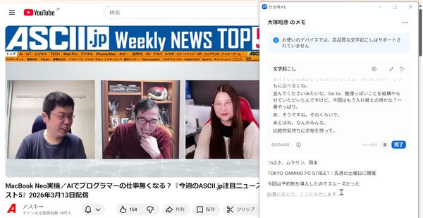 たとえば、YouTubeで配信されるウェビナーを聴講しながらメモを取るとき、自分で細かくメモを取らなくても、AI Companionが文字起こしや要約をしてくれます。また、1人で考えごとをしながらアイデアを口頭でしゃべり、AI Companionに口述筆記で要約してもらう、といった使い方もできそうです。