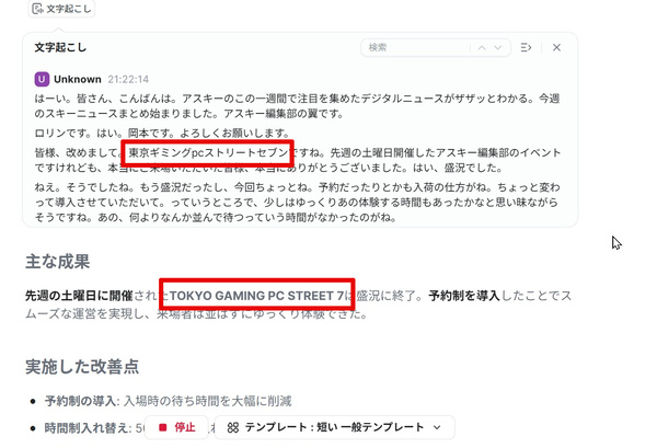 その反対に、自分(ユーザー)のメモがAI Companionの理解を“補強”する側面もあります。音声からのAI文字起こしでは、どうしても聞き間違いや固有名詞の誤字が発生します。しかし、My Notesに正しい言葉を入力しておけば、そうした誤りが補正されるのです。たとえば、会議の参加者名、議論に登場した企業名や製品名をメモしておくだけでも間違いが減り、あとから議事録を修正する必要が少なくなります。
