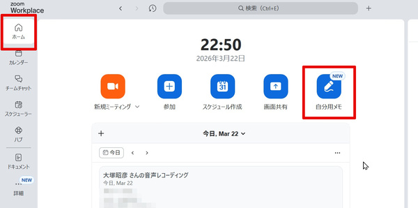 ちなみに、Zoom Workplaceアプリを起動していると、Zoom、Teams、MeetのWeb会議が始まると「メモ機能が利用可能です」というポップアップが表示されます。このボタンからMy Notesを起動して、記録をスタートすることもできます。