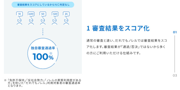 従来のローン/リース審査では、審査結果が「通る/通らない」の二通りしかなかったため、「貸し倒れリスク」には慎重にならざるを得ず、審査に通らないケースが多かった。この問題を解決するため、ノレルでは細かな指標に基づく貸し倒れリスクのスコアリングを行い、このスコアに応じてサービスを提供している。
