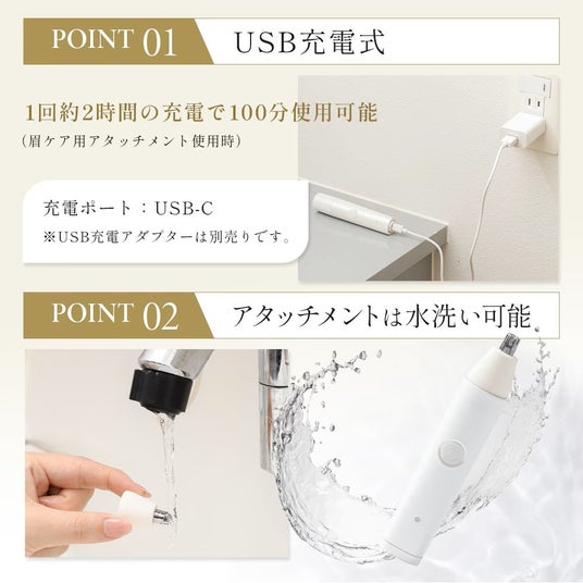 「フェイスケア用」「ノーズケア用」「眉ケア用」の3種類のアタッチメントに加え、眉の長さを整える「コーム」も付属しています。 これ1本で、うぶ毛や鼻毛のカットはもちろん、眉の形作りから長さ調整まで、顔周りのムダ毛をトータルでお手入れできます。アタッチメントを付け替えるだけの簡単操作で、用途に合わせた最適なケアが可能です。