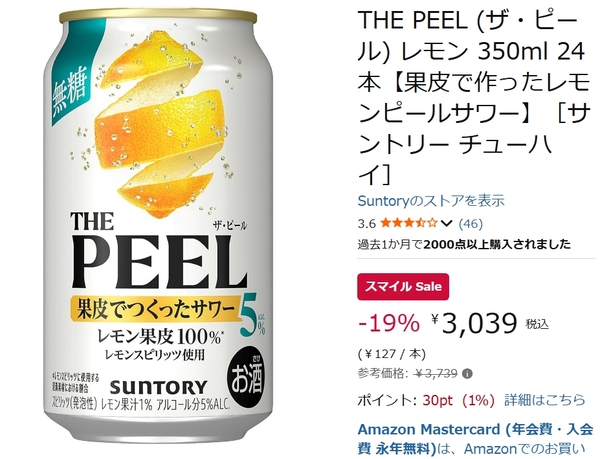 果皮にこだわった製法と、香料・糖類無添加という特徴を持つサントリー「THE PEEL レモン」は、現在開催中のAmazonスマイルセールでは、19%オフという割引が適用されており、1本あたり約127円と手に取りやすい価格になっています。