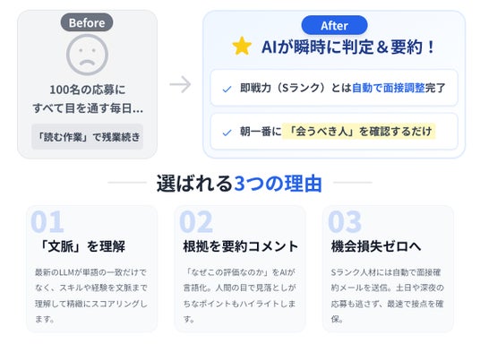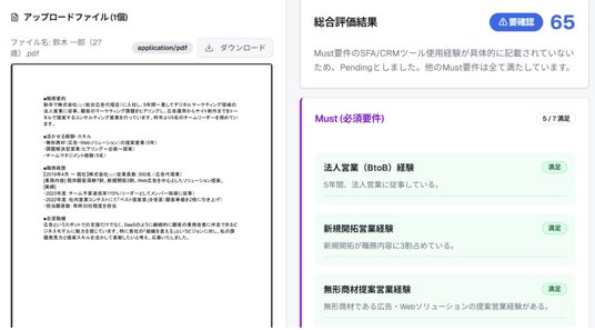 単にスコアリングするだけでなく、「なぜこの評価なのか」という根拠をAIが要約して提示します。「実務経験は短いが、使用技術スタックが募集要項と合致している」といった、人間の目で見落としがちなポイントもハイライトします。