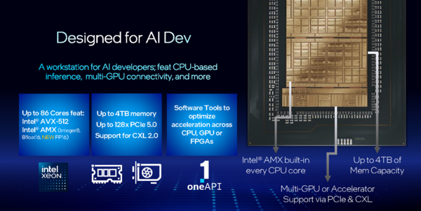 Pコアを最大86基搭載し、前世代からシングルスレッドで最大9%、マルチスレッドでは最大61%も性能が向上しています。AI開発でも有用な設計になっており、Intel AVX-512のほか、Intel AMXは従来のINT8やBF16のほか、新たにFP16もサポート。