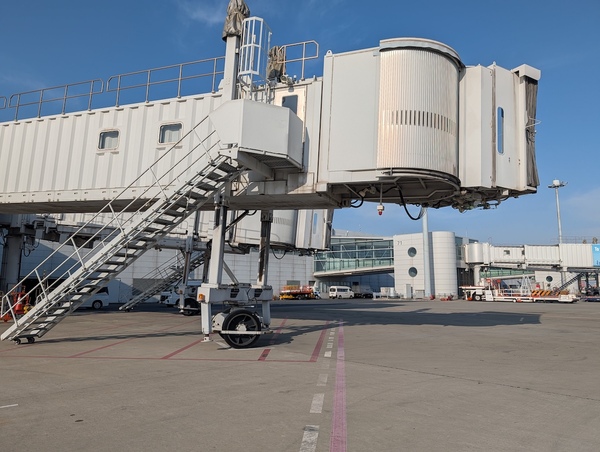 空港設備でもありますが、ターミナルビルから伸びている、機体とビルを直接つなぐ可動式の橋。雨の日でも濡れずに移動できる、私たちにとって最も馴染み深い設備です。車輪がついており、操作盤で操ることで様々な機種のドア位置に合わせることができます。