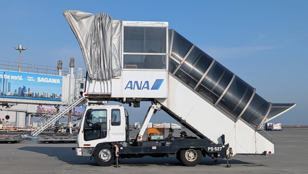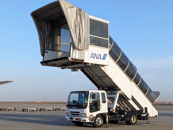 いわゆる「タラップ車」です。PBBがない駐機スポット(オープンスポット)に飛行機が止まった際、機体に横付けして「動く階段」として活躍します。ここから乗り降りする際は、飛行機の大きさを間近で感じられるため、移動の手間はあるものの、航空ファンには隠れた人気があります。