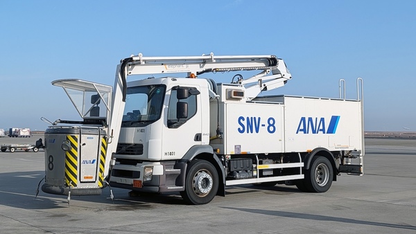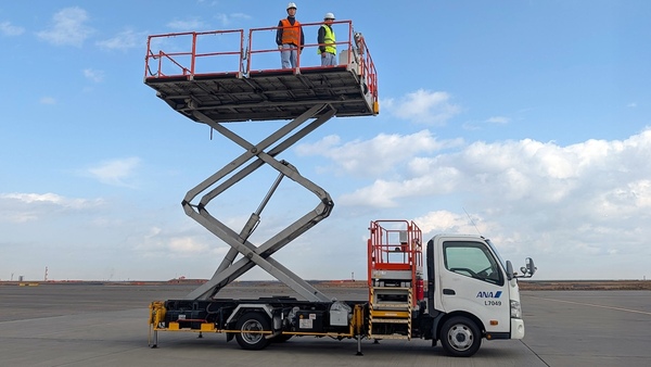 トラックの荷台部分がそのまま垂直に上昇するユニークな車両。エンジンや翼、ドアなど、高所にあるパーツの整備を行う際に使用されます。重い整備機材を持ち上げたり、整備士さんが乗り込んで作業したりするための「足場」となります。