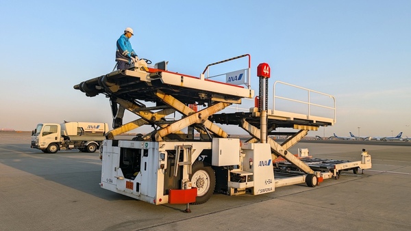 平べったい形をしていて、巨大な昇降機(シザーズリフト)がついた車両です。コンテナやパレットを機体の貨物室の高さまで持ち上げることができます。大型機の貨物室は高い位置にあるため、この車両を使ってダイナミックに積み下ろしを行います。2つの台(プラットフォーム)が連携して動く様子は見ていて飽きませんよ。