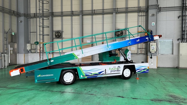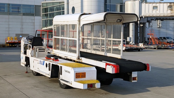 ハイリフトローダーがコンテナ用なら、こちらは「バラ積み」用の車両です。車両にベルトコンベアが装備されており、貨物室のドアまでベルトを伸ばして、スーツケースや小包などを連続して送り込みます。中小型機や、コンテナに入らない形状の荷物を積み込む際によく使用されます