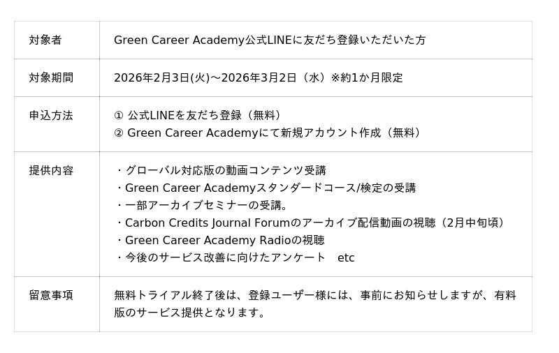 Green Career Academy公式LINEに友達登録いただいた方を対象に、2026年2月3日(火)~2026年3月2日(月)まで1か月無料で利用可能となるキャンペーンを実施します。世界的に加速する脱炭素潮流に備えるため、誰もが“すぐに学べる・深く理解できる”新しいGX学習体験をお届けし、脱炭素スキルを「キャリアの武器に」にします。下記URL、QRコードよりLINE友達登録をお願いします。