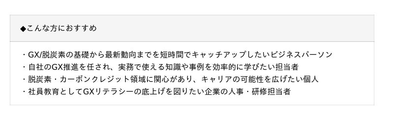 企業においても、“GX人材(グリーントランスフォーメーションを推し進め、実行できる人材)”の育成が大きな課題になっています。しかし現状、GX・脱炭素の知識を体系的かつ実務レベルで学べる学習ツールはほとんどありません。