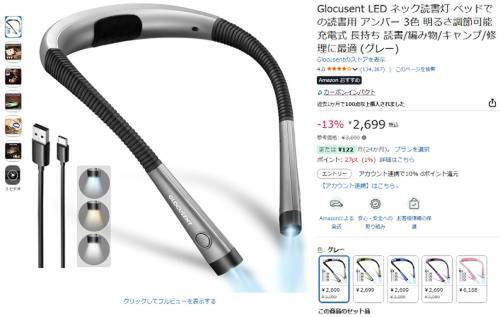 GlocusentのLEDネック読書灯が、Amazonのセール対象になっています。参考価格3,099円のところ、13%オフの2,699円で販売中です。