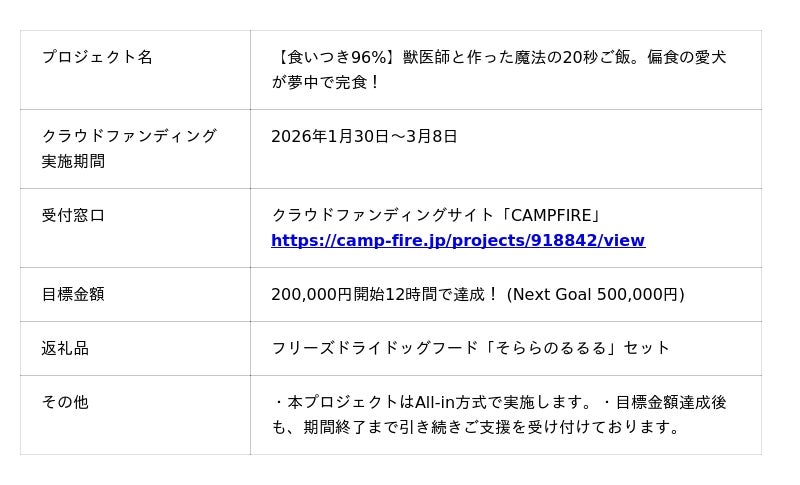 【食いつき96%】偏食の愛犬が夢中で完食!獣医師と共同開発した“魔法の20秒ごはん”「そららのるるる」 クラウドファンディング開始12時間で目標達成