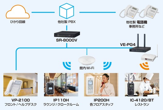 PBXは、スタッフの持つ構内PHSや各客室の固定電話での内線電話に必要な構内交換機で、多くのホテルで活用されています。内線・外線可能なIP電話システムを構築できる、当社のVoIPルーター(SR-8000V)を導入することで、本来、直接通話のできない構内PHSや固定電話と、「IP200H」などのモバイルIPフォンとの通話を可能にします。既存の通信インフラと「IP200H」を共存させることで、導入コストを抑えたまま、新たな通信環境を構築できます。