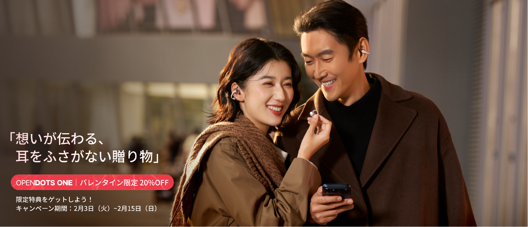 バレンタインは、恋人や家族、友人へ感謝や想いを伝える特別な日です。しかし、イヤホンで音楽に没入することで、近くにいる人との会話が減ってしまうことも少なくありません。Shokzの「OpenDots ONE」は、耳をふさがないオープンイヤー型イヤホンです。音楽を楽しみながらも、周囲の音や大切な人の声を自然に感じることができます。「一緒に過ごす時間をより心地よいものにしてほしい」そんな想いを込めて、本キャンペーンを企画しました。
