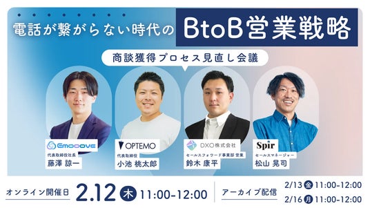 新時代の営業手法を提案する株式会社Emooove(本社:東京都品川区、代表取締役CEO:藤澤諒一)は、2026年2月12日(木)に開催されるウェビナー『電話が繋がらない時代のBtoB営業戦略 ~商談獲得プロセス見直し会議~』に登壇することをお知らせいたします。