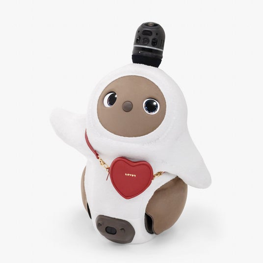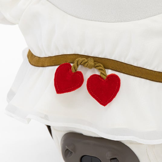 胸元で揺れる赤いハートがキュートなアクセントになり、後ろ姿には天使をイメージしたふわふわのファー素材の羽根をあしらいました。やわらかなホワイトカラーがLOVOTを優しく包み込む、こだわりのデザインです。