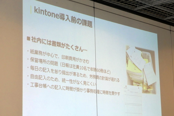 kintone導入前、富士冷暖は紙業務中心で印刷費用がかさんでいた。特に日報は社員10名で年間60冊ほどとなり、保管場所も必要。毎日の記入を怠り、提出が滞ったため、労務費の計算が遅れることもあった。「今までは現場から疲れて会社に帰ってきて、そこから日報を一生懸命入力しなければならなかった。入力が滞ると、2日ごと、3日ごとまとめてやるようになっていた」と長田氏。また、自由記入のため、統一感がなくて見にくく、工事台帳への記入に時間がかかるという課題もあった。