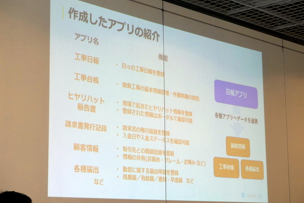 続いて長田氏は、実際にkintoneで作ったアプリを披露する。長らく課題だった工事日報を実現するため、まずは取引先や社員、顧客などを管理するためのマスターアプリを作成するところからスタート。やりとりを重ねていくうちに、工事台帳の作成アプリや請求書の発行アプリまで作ることになった。
