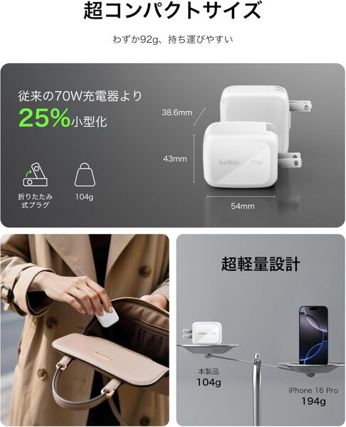 それでいて高出力に対応しており、ノートPCの充電も現実的にこなせます。自宅のデスクに常設しても邪魔にならず、カバンに入れて持ち歩く充電器としてもストレスがありません。
