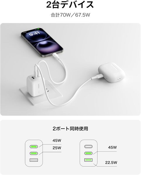 3ポート構成も実用的です。USB Type-Cポートを2つそなえているため、最新のスマートフォンやタブレット、USB Type-C充電対応のノートPCを同時に充電できます。