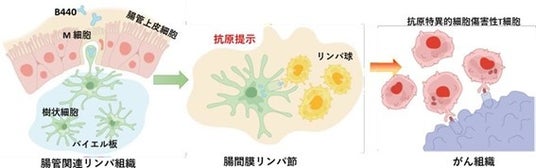 経口投与された B440 は腸管上皮中の M 細胞からパイエル板中の樹状細胞に取り込まれ腸間膜リンパ節に移動します、B440 が提示していた抗原タンパク(腫瘍抗原 WT1)は樹状細胞内で処理され、その断片が樹状細胞表層に抗原提示されます。この抗原提示樹状細胞がリンパ節内のリンパ球を活性化し、がん細胞を攻撃する細胞傷害性 T 細胞を誘導します。
