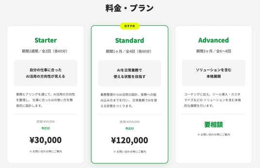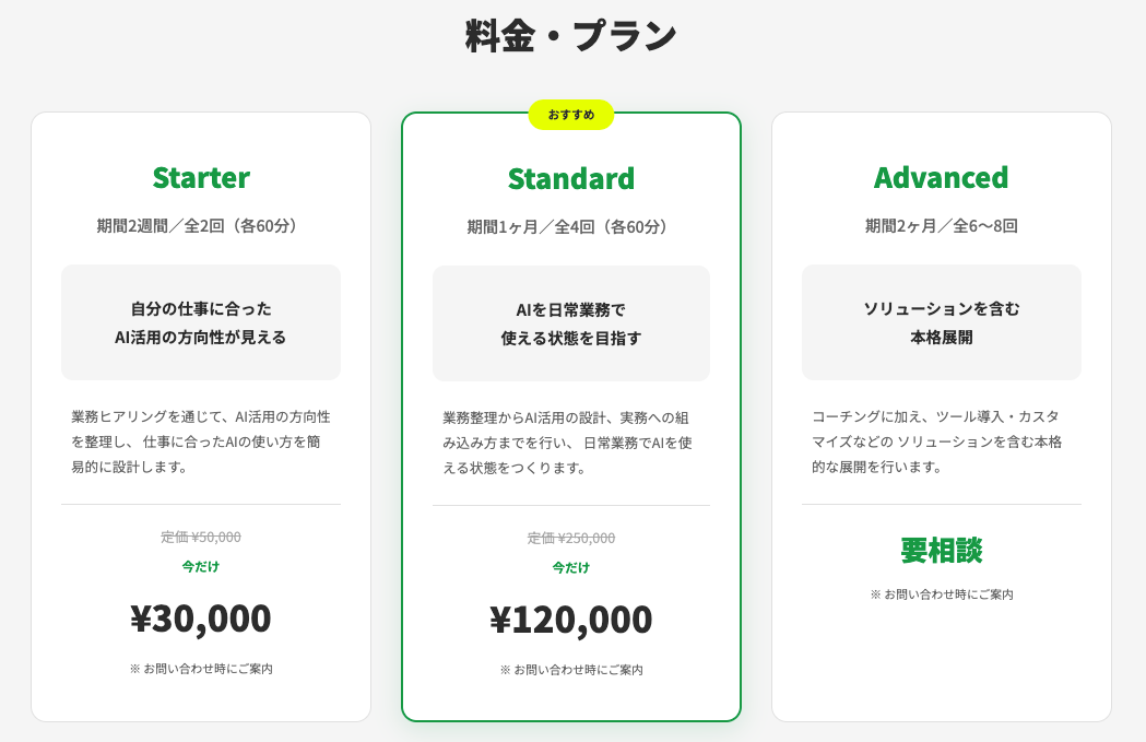 ・Standard(250,000円): 全4回のコーチングを通じて、AIを日常業務で使いこなせる仕組みを構築します。