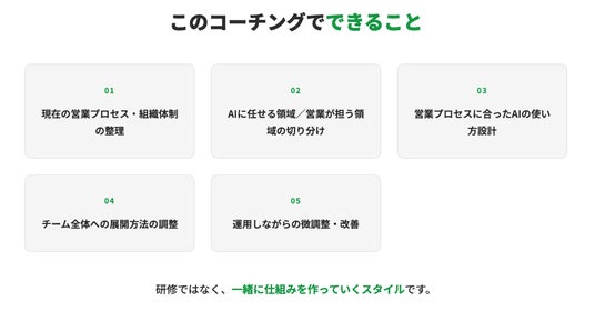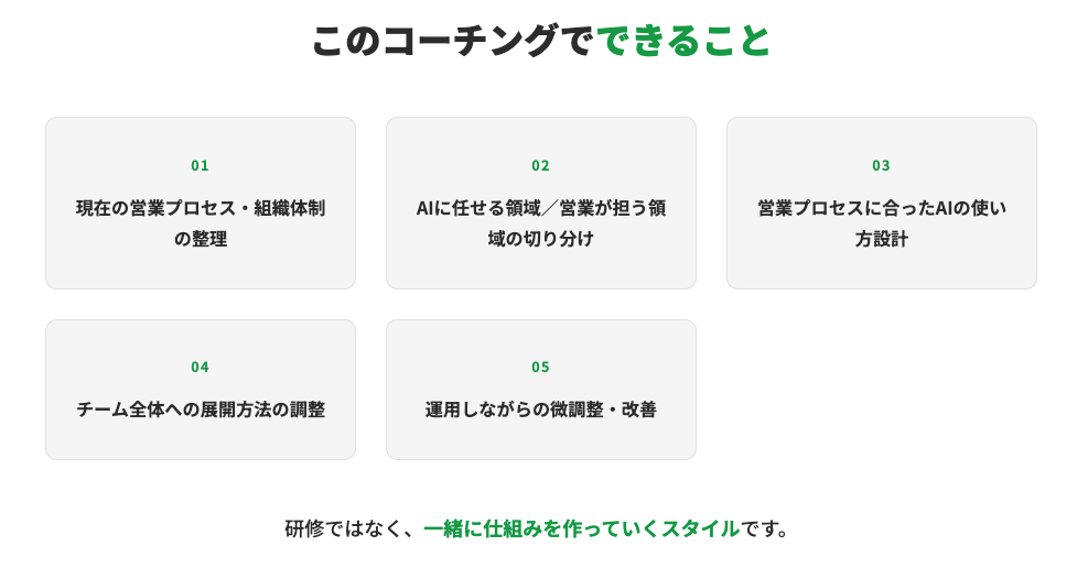 本サービスは単なるツールの提供ではなく、営業組織の解像度が高く、AI活用にも長けたコーチと共に「自社専用のAI活用ルール」を作り上げ、現場に定着させる伴走型プログラムです。