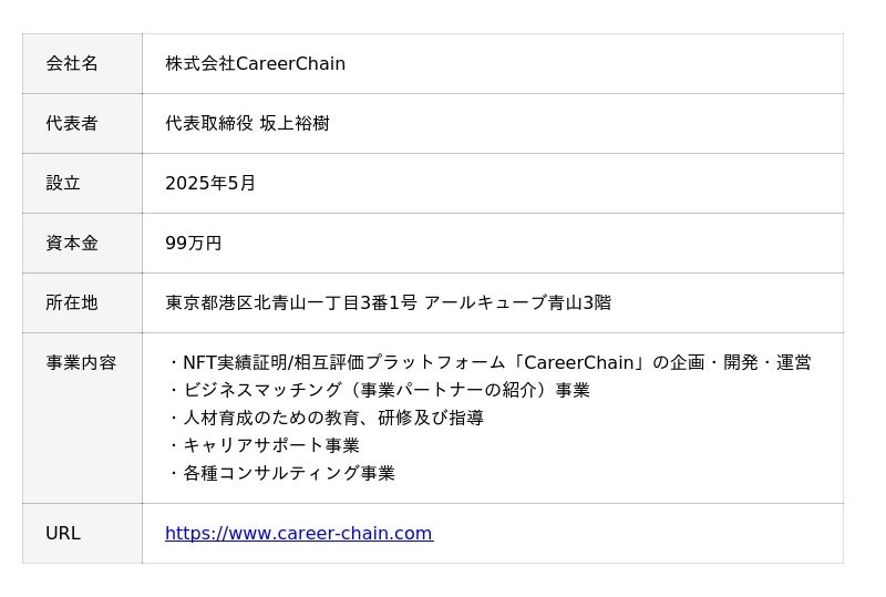 株式会社CareerChain(本社:東京都港区、代表取締役:坂上裕樹、以下「当社」)は、2026年2月、NFT技術を活用した実績証明や相互評価の仕組みを導入するキャリアプラットフォーム「CareerChain(キャリアチェーン)」をリリースいたします。