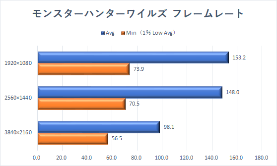 最後は、重量級ゲーム3タイトルのパフォーマンスを確認した。まずは「モンスターハンターワイルズ」だ。時間の関係でフレームレートの計測はアップデート前のバージョンで検証しているが、最新のVer.1.040.03.01では、CPUとGPU処理の見直しなどが実施され、動作が軽くなっている。