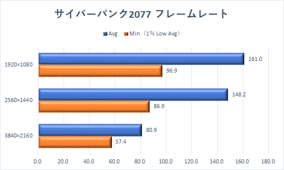 「モンスターハンターワイルズ」と同じく、4K解像度ではMin(1% Low Avg)は60fpsを切ってしまうが、WQHD解像度なら「サイバーパンク2077」の世界観を堪能できるフレームレートを維持できている。