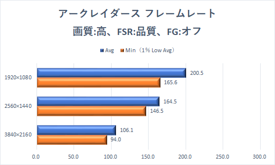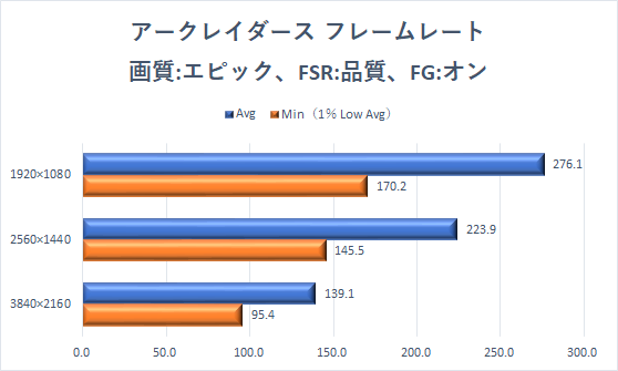 フレーム生成を使わずとも、プリセット「高」なら、4K解像度でもMin(1% Low Avg)は、60fps超えを記録している。リフレッシュレート120Hzや144Hzの張り付きプレイは、画質やFSRの品質を1段下げるなどのカスタマイズが必要だが、フルHDとWQHDでの高リフレッシュレート駆動プレイを楽しめるパフォーマンスだ。