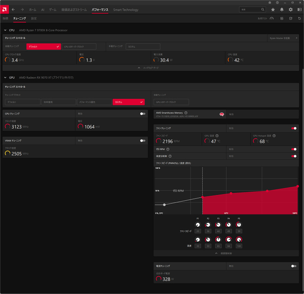 カスタマイズ時のGPUコアクロックは、若干ダウンしているが、「Radeon RX 9070 XT GAMING OC 16G」の大きな魅力となるGPUコアの高オーバークロック動作を維持しており、3100MHz台で安定して動作している。