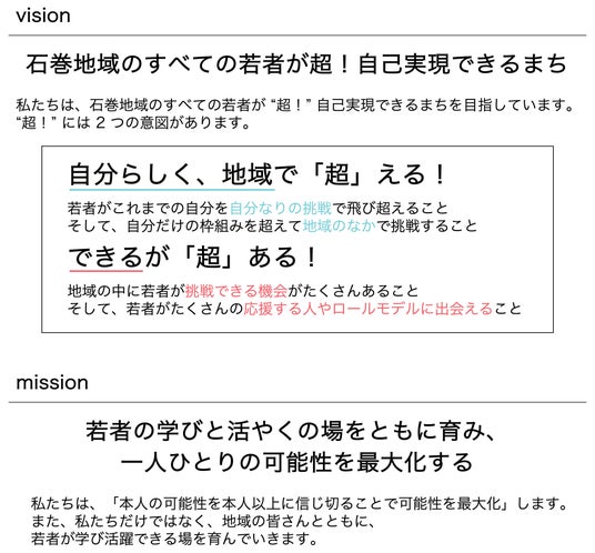 「石巻地域のすべての若者が超!自己実現できるまちへ」をビジョンに掲げ、学校・行政・地域と連携しながら、高校生を中心とした若者の様々なチャレンジや成長をサポートする活動を行っています。