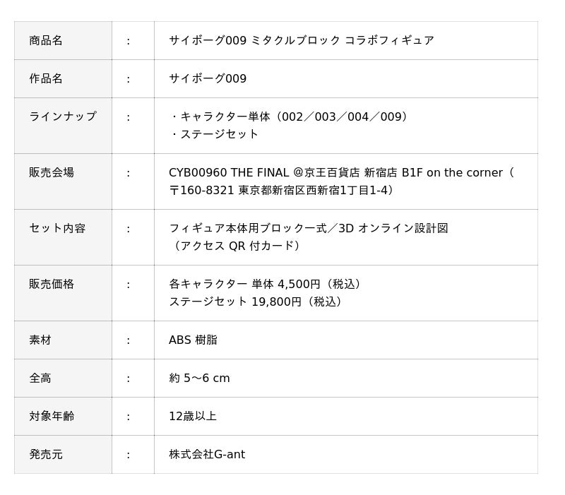 株式会社G-ant(所在地:東京都中央区、代表取締役:平川 彰悟)は、石ノ森章太郎原作の名作『サイボーグ009』誕生60周年を記念し、組み立てブロックフィギュア「ミタクルブロック」シリーズより『サイボーグ009』フィギュアを発売いたします。