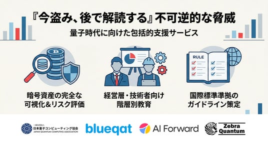 一般社団法人日本量子コンピューティング協会(本部:東京都中央区、代表理事:高野 秀隆、以下「当協会」)は、blueqat株式会社(本社:東京都渋谷区、代表取締役:湊 雄一郎)、株式会社AI Forward(本社:東京都中央区、代表取締役:寺園 諒雅)および株式会社ZebraQuantum(本社:東京都中央区、代表取締役:寺園 諒雅)と提携し、将来的な量子コンピュータによる暗号解読リスク(量子脅威)に対応する「耐量子計算機暗号(PQC)総合移行支援サービス」を、2026年2月4日より提供開始いたします。