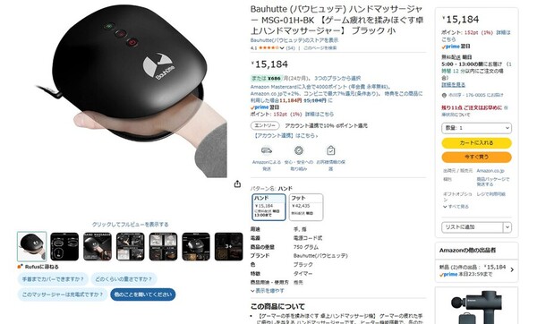 Amazon.co.jpにて、Bauhutte (バウヒュッテ)のハンドマッサージャー「MSG-01H-BK」が販売中だ。価格は1万5184円。