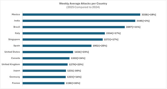 2025年における国別の週平均攻撃数(対2024年比)