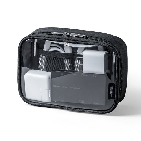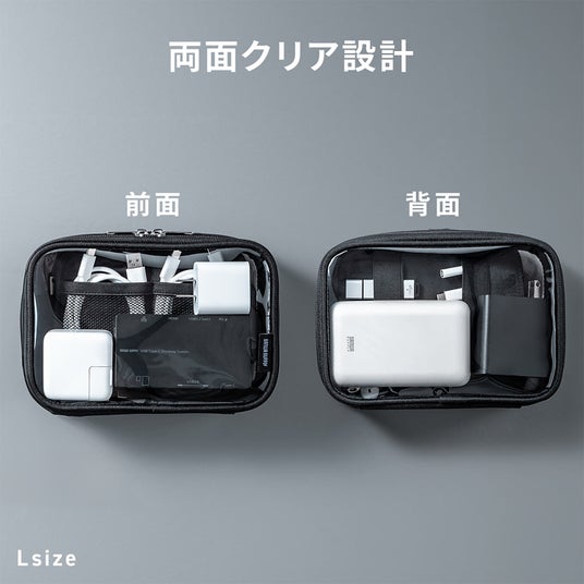 表裏ともに透明素材を採用したクリアポーチなので、どこに何が入っているかが一目で分かります。出先で「あれどこに入れた?」と探す時間を減らし、移動中や商談前の準備もスマートに。ガジェット収納にありがちな“迷子”を防ぐ設計です。
