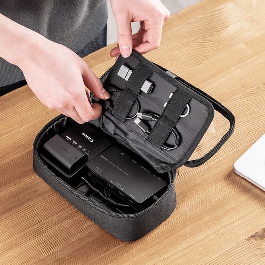 本製品はガジェット収納はもちろん、旅行や出張の小物整理にもおすすめです。たとえばカメラ用品、文具、衛生用品など、細かいアイテムを“見える状態でまとめる”のに最適。クリア素材だからこそ、忘れ物防止にも効果的です。
