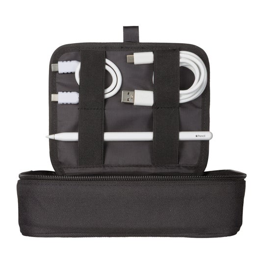 内部にはゴムバンドとメッシュポケットを搭載。ケーブル・充電器・USBメモリなど小物類を固定しながら整理でき、ポーチ内のごちゃつきを抑えます。収納の「見やすさ」と「取り出しやすさ」を両立しました。