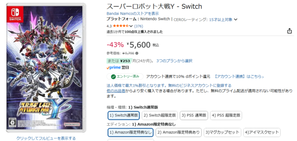 そんな私が今回オススメしたいゲームタイトルは、「スーパーロボット大戦Y」です。パッケージ版の参考価格は9,790円ですが、今なら44%オフの5,500円でAmazonから購入できます。