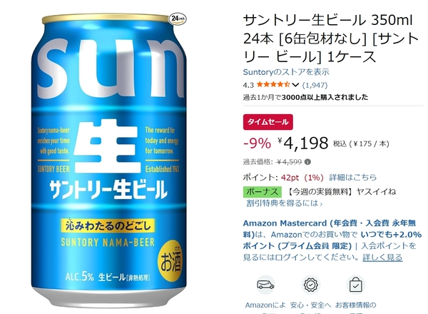 「サントリー生ビール 350ml 24本」が、現在開催中のAmazonタイムセールに登場しています。