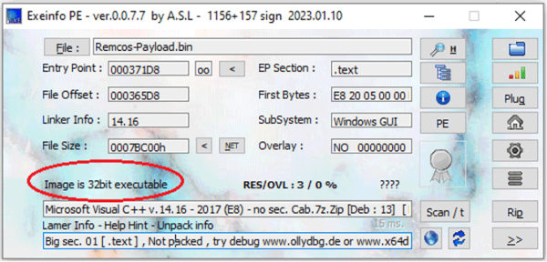 Remcosのペイロードファイルは攻撃の全段階を通じてファイルレスのままですが、PowerShellプロセスのメモリからダンプすることができます。図13に示すように、このペイロードはMicrosoft Visual C++でコンパイルされた32ビット実行ファイル(EXE)であり、パッカーによる保護は施されていません。